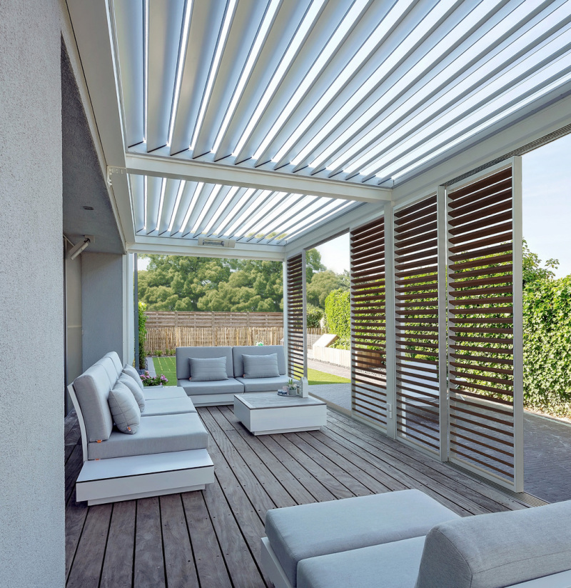 V755 besteht aus einem leichtgängigen Gleitrahmen mit Aluminiumlamellen. Durch die Schrägstellung der Lamellen bietet der Schieberrahmen Schutz vor einfallendem Sonnenlicht und bricht den Wind.